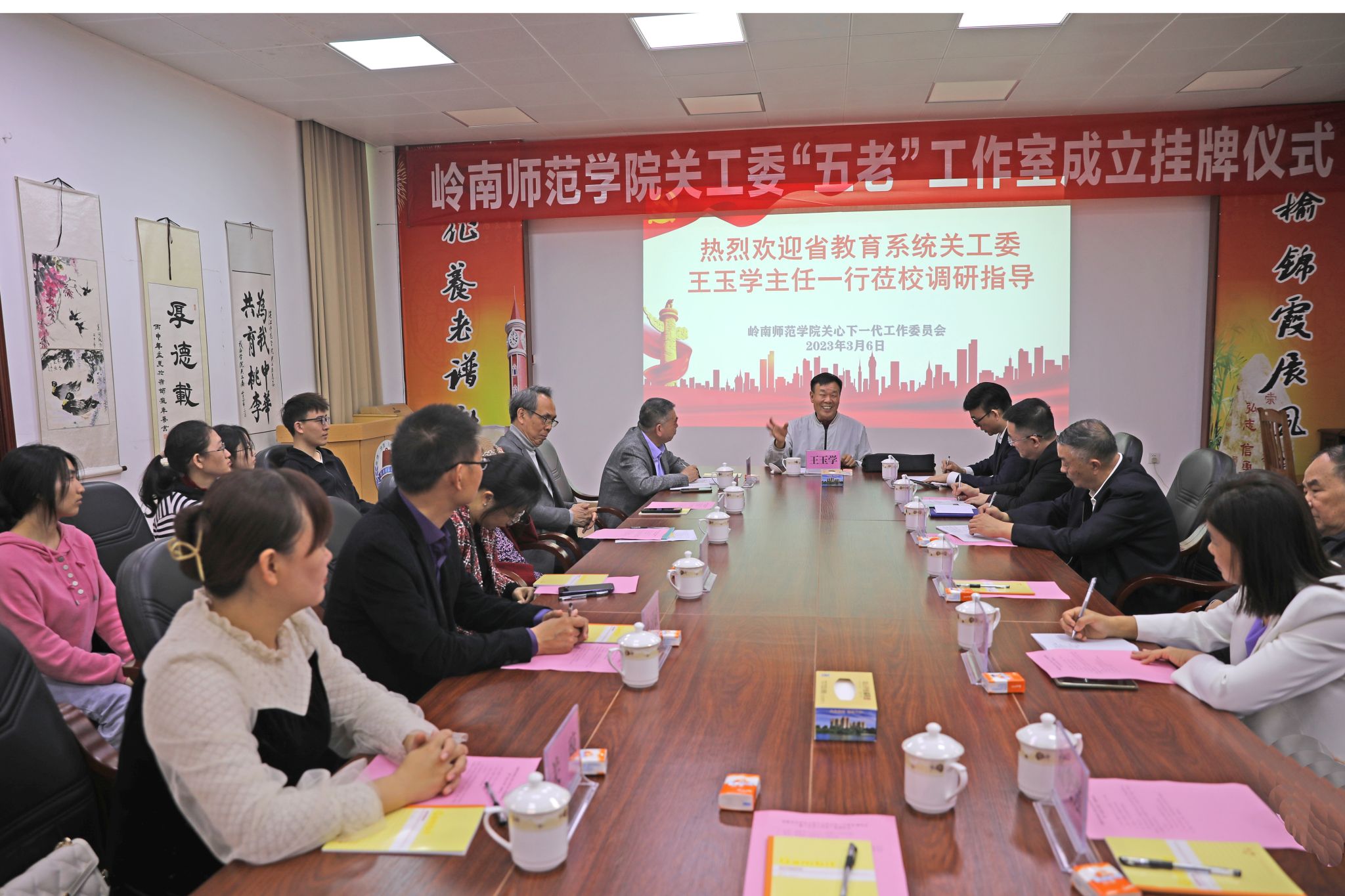岭师新闻中心讯:3月6日下午,省关工委副主任、省教育系统关工委主任王玉学一行莅校调研,并为岭南师范学院关工委新成立的“刘海涛名师工作室”、“五老”法治教育工作室揭牌。学校党委副书记黄达海出席调研会和揭牌仪式,双方在学校离退休人员服务中心会议室举行工作座谈会。