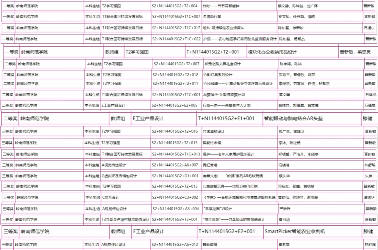 近日,2023第11届未来设计师·全国高校数字艺术设计大赛省级赛结果出炉,29个赛区分别评出一二三等奖和优秀组织奖。我校机电工程学院工业设计专业学子(涉及2019、2020、2021级)的设计作品获广东、澳门赛区一等奖4项、二等奖5项、三等奖10项;教师组晋新敏老师的设计作品获得一等奖1项,滕健老师的设计作品获得二等奖、三等奖各1项;另外,学校获“优秀组织单位”,晋新敏老师获得了“优秀组织教师”,石旭东、晋新敏老师获得了“优秀指导老师”。获得省级赛一、二等奖的作品将继续进军全国总决赛。