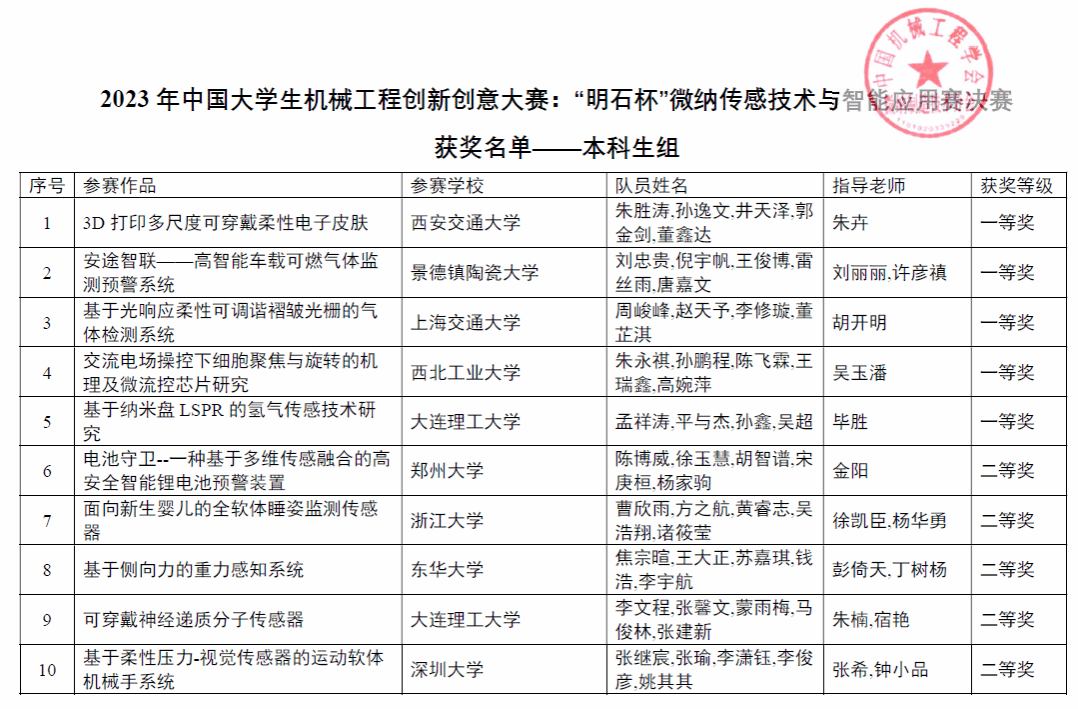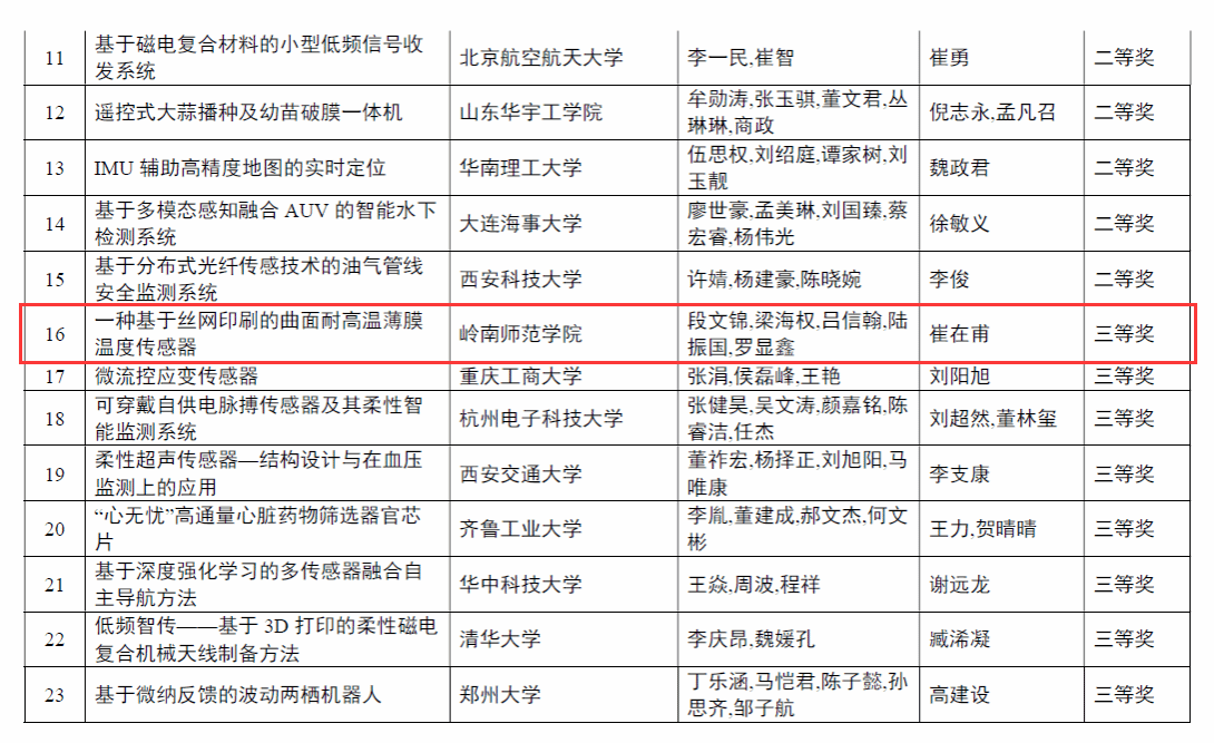 8月13日,2023年中国大学生机械工程创新创意大赛:“明石杯”微纳传感技术与智能应用赛全国总决赛在山东省烟台市落下帷幕。我校机电工程学院指导教师崔在甫指导的作品《一种基于丝网印刷的曲面耐高温薄膜温度传感器》获得初赛一等奖(第85名)并进入决赛,在决赛中91个项目中获得第16名,最终获得三等奖第一名的好成绩。