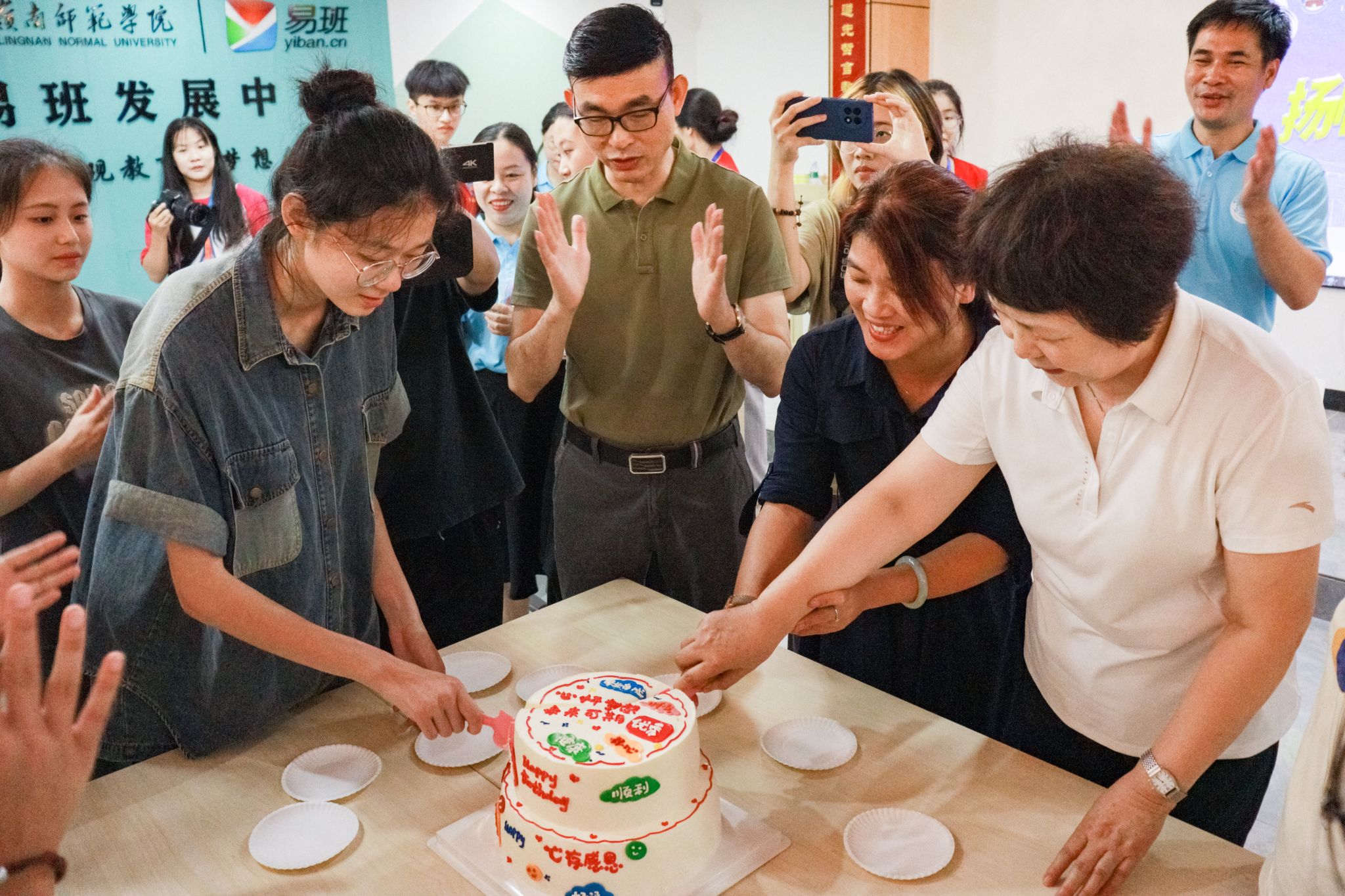 党委书记兰艳泽为开学报到日恰逢生日的11名2023级新生切分蛋糕、共度“生日会”