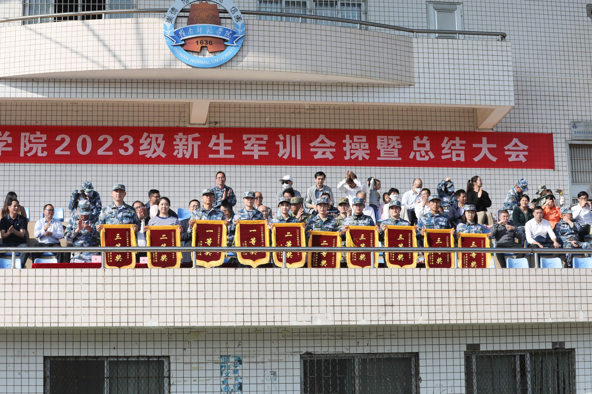 军训教官,党委办、校长办、宣传部、学生处、安保处、教务处、校团委主要负责人,各二级学院党委书记、院长、党委副书记、带训辅导员,2023级全体参训学生参加本次总结大会。