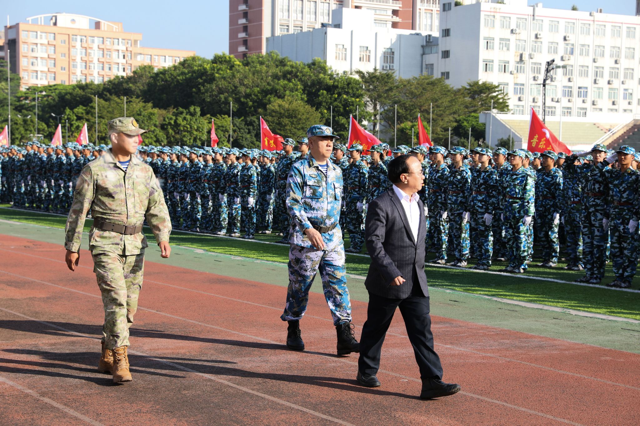 “同学们好!同学们辛苦了!”苏古发逐一检阅受阅方队。“首长好!为人民服务!为学院争光!”19个二级学院受阅方队行注目礼,报以洪亮坚定的回答。
