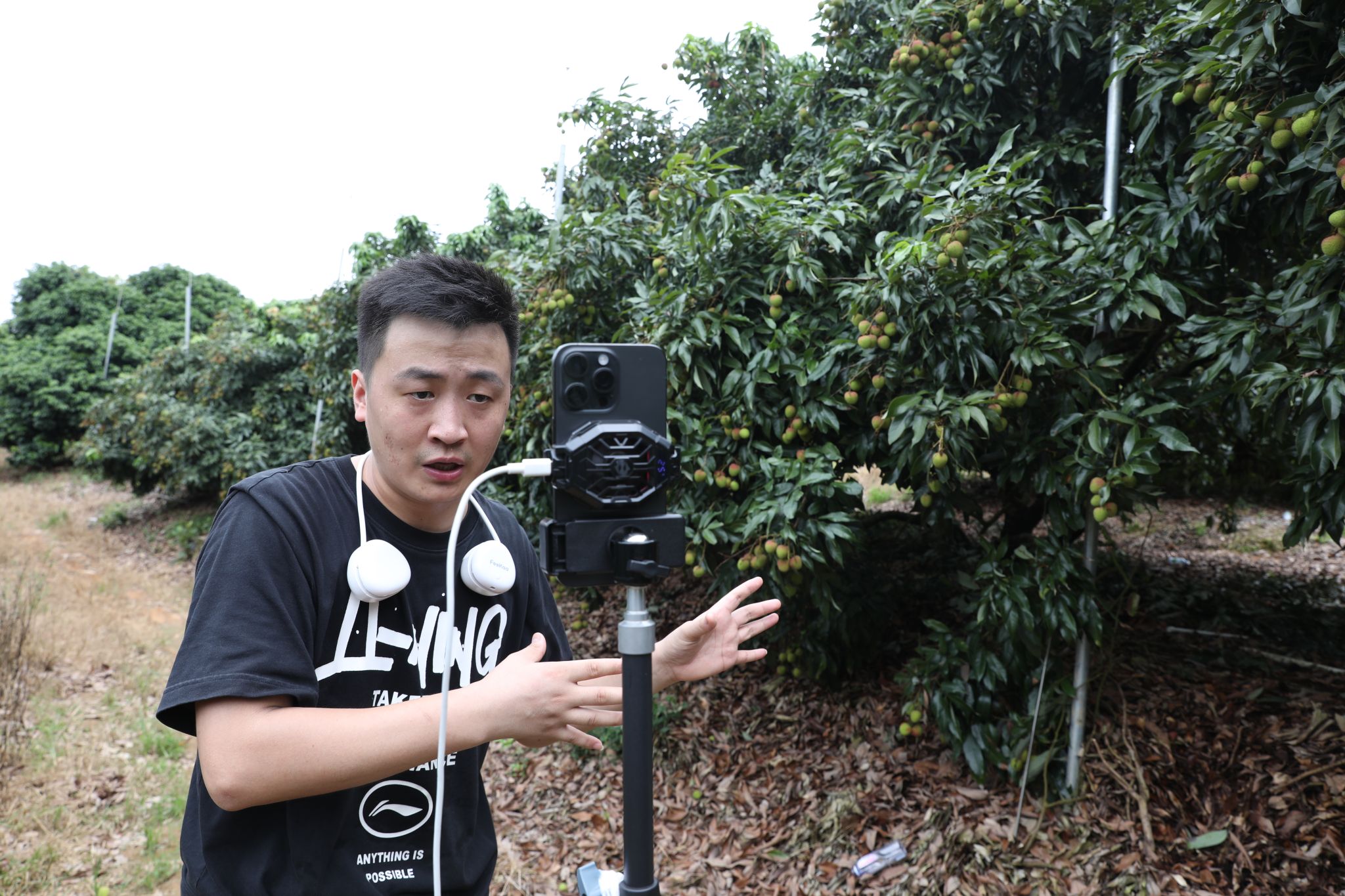 记者看到,一串串青色中带着绯红的荔枝挂满枝头,每一个果子都像是羞涩的少女脸上点缀的胭脂红色,微风的浮动下不停地在向主播点头微笑。主播、助播带着设备边走边介绍,旁边的果农在采摘、运送荔枝,现场一片繁忙景象。