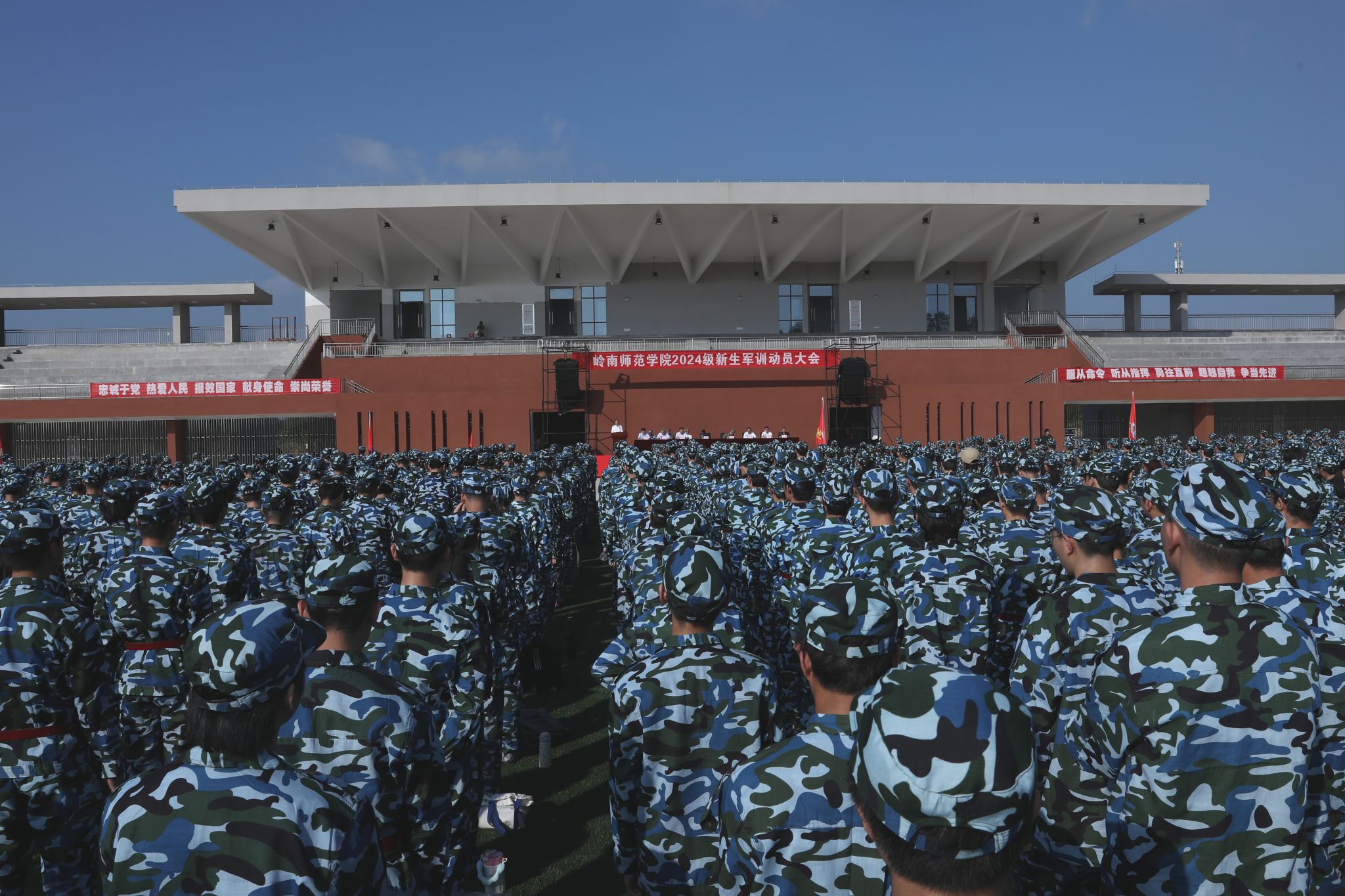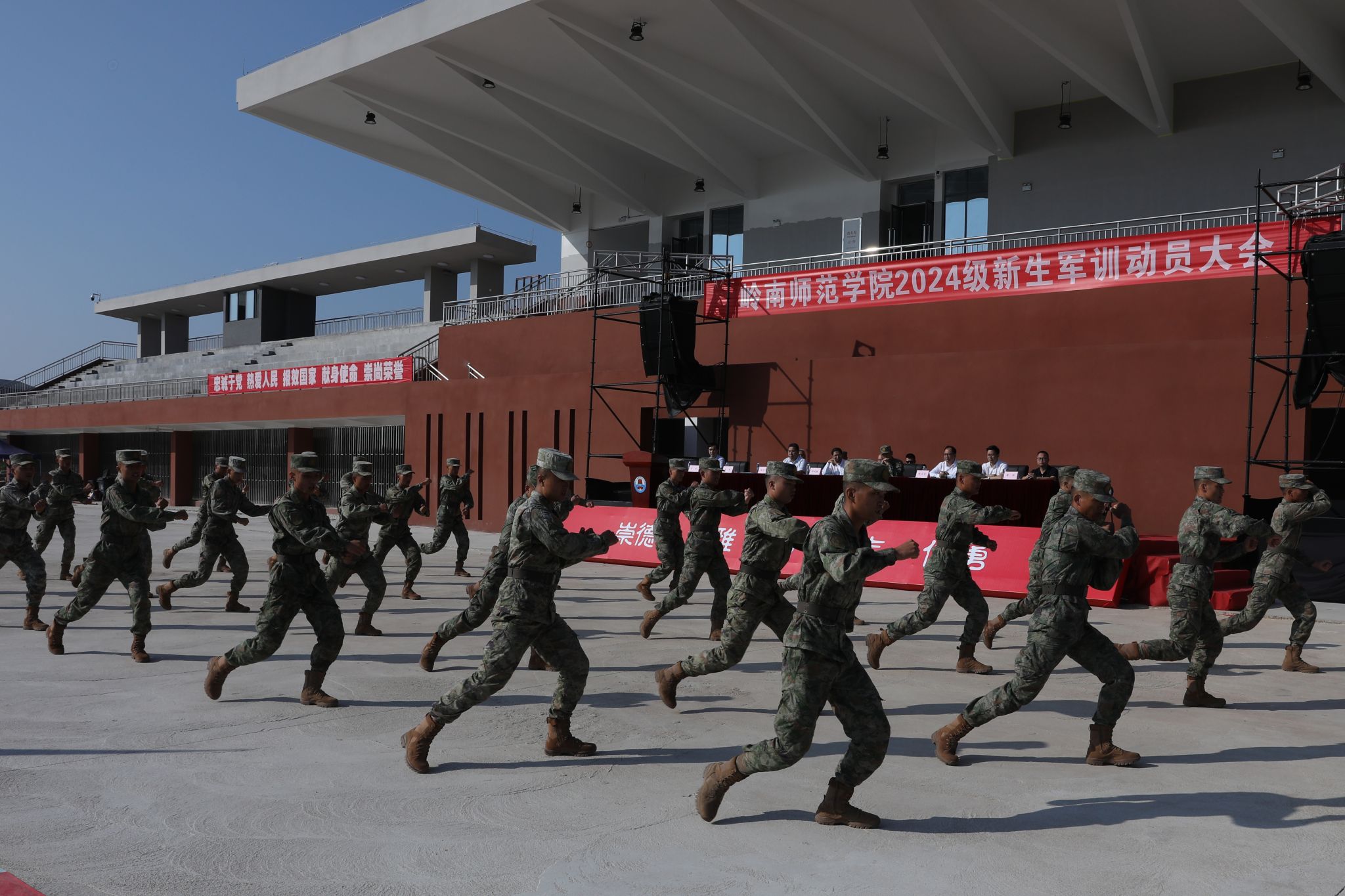 驻湛某部队承训官兵,学校校长办公室、党委宣传部、学生处、党委武装部、教务处、校团委,各二级学院党委副书记、辅导员,2024级全体新生参加了军训动员会。