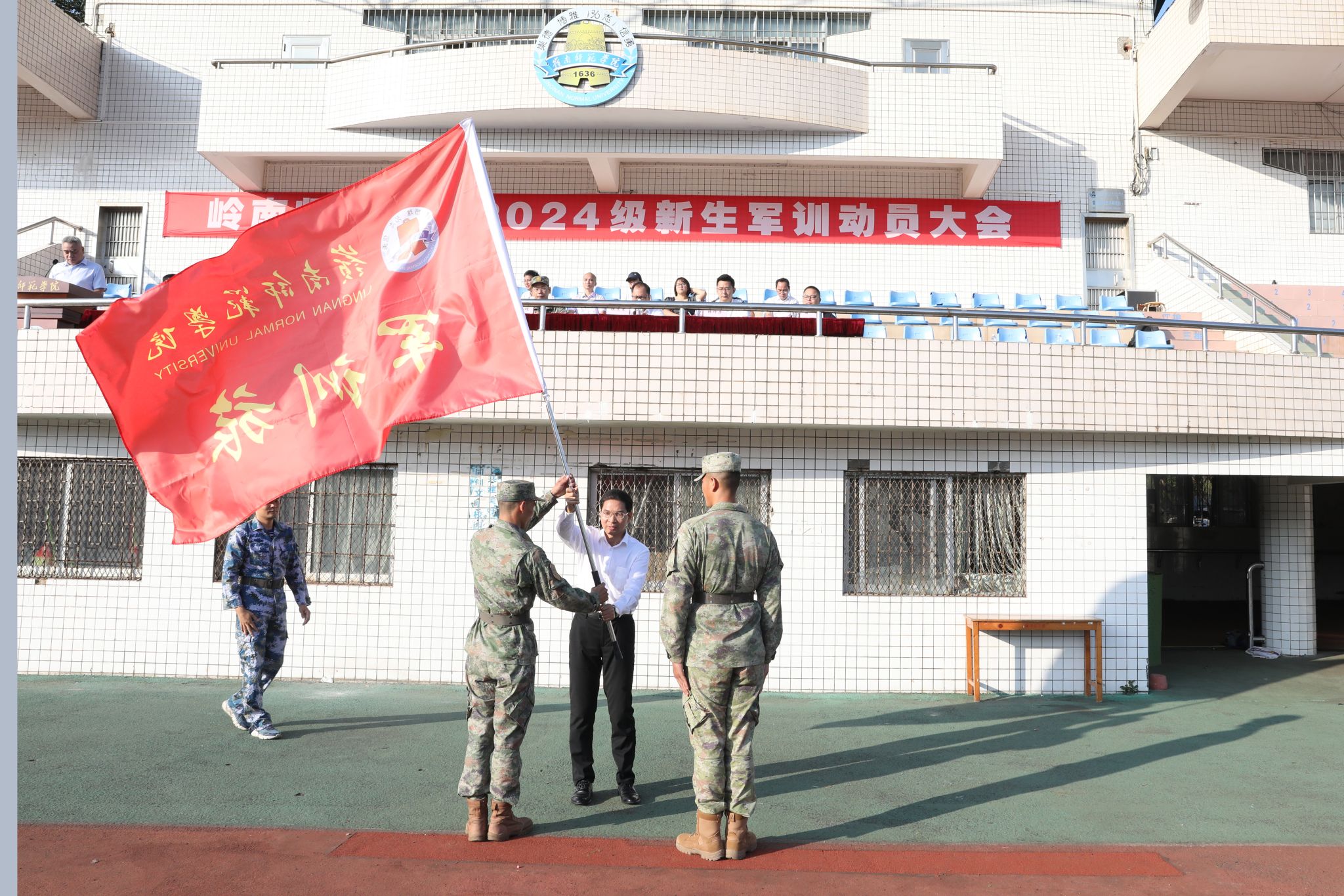 岭师新闻中心讯:11月18日,学校分别在寸金校区雷阳田径运动场、湖光校区田径场召开2024级新生军训动员大会,并举行授旗仪式,9740名2024级新生军训正式拉开帷幕。承训部队首长和学校党委副书记林晓敏出席会议并作军训动员讲话。学校党委武装部部长李博主持会议。