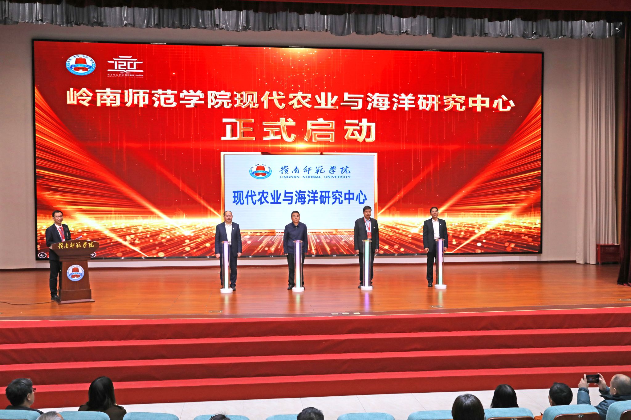 中国工程院院士刘少军和徐明岗与校领导一起在专题报告会上为岭南师范学院现代农业与海洋研究中心揭牌