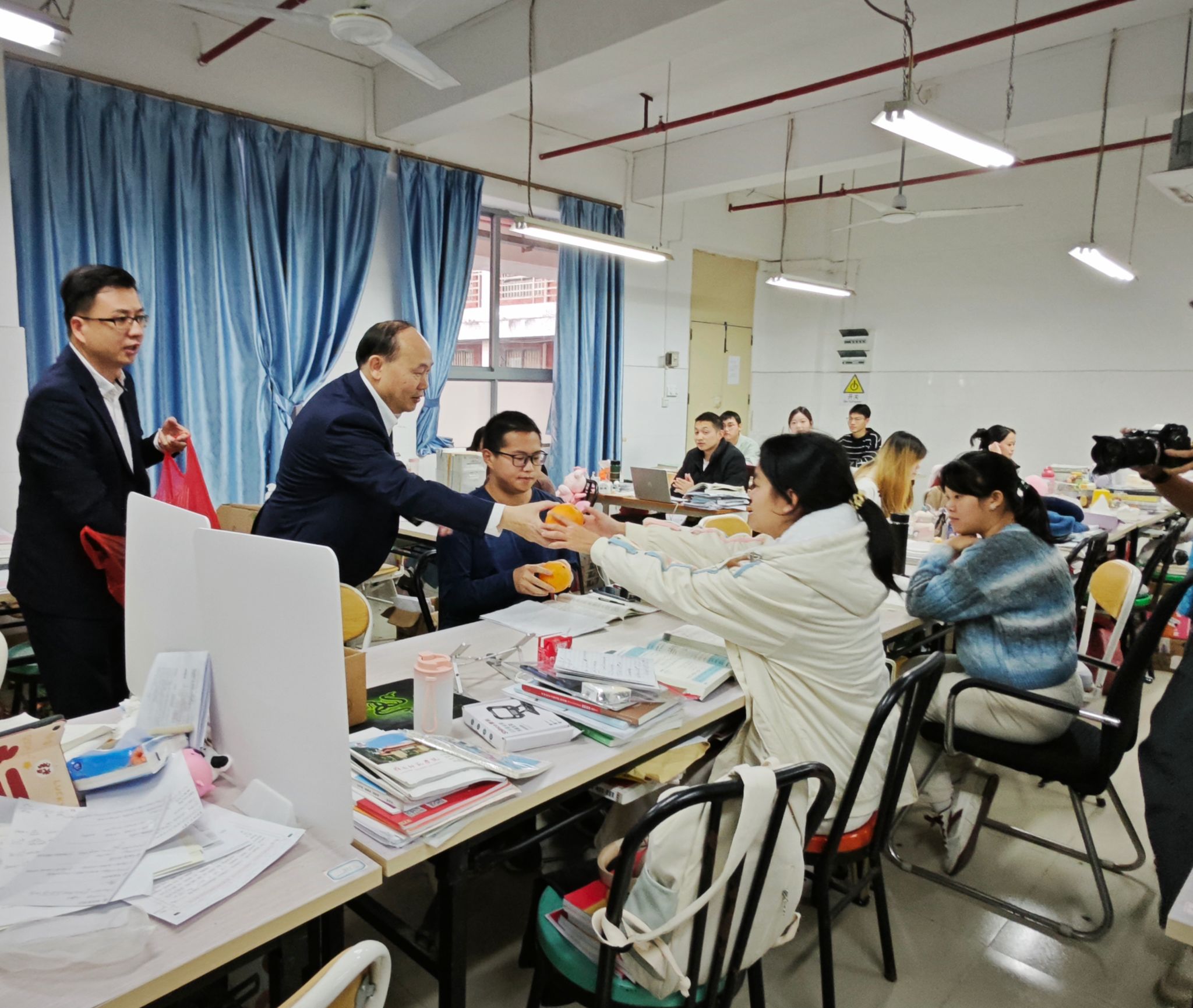 走访过程中,阳爱民一行走进“青年驿站”“岭梦空间”及二级学院考研课室,与学生们进行亲切交流。他们鼓励学生勇敢面对挑战,保持信心,以积极的心态和饱满的精神状态迎接考试。他亲切地询问同学们的备考情况,并面带微笑地将寓意“一战成硕”的红橙分发给学生们。林晓敏指出,红橙寄托了对每位学生的美好祝愿,希望他们都能心想事“橙”,顺利考上研究生。