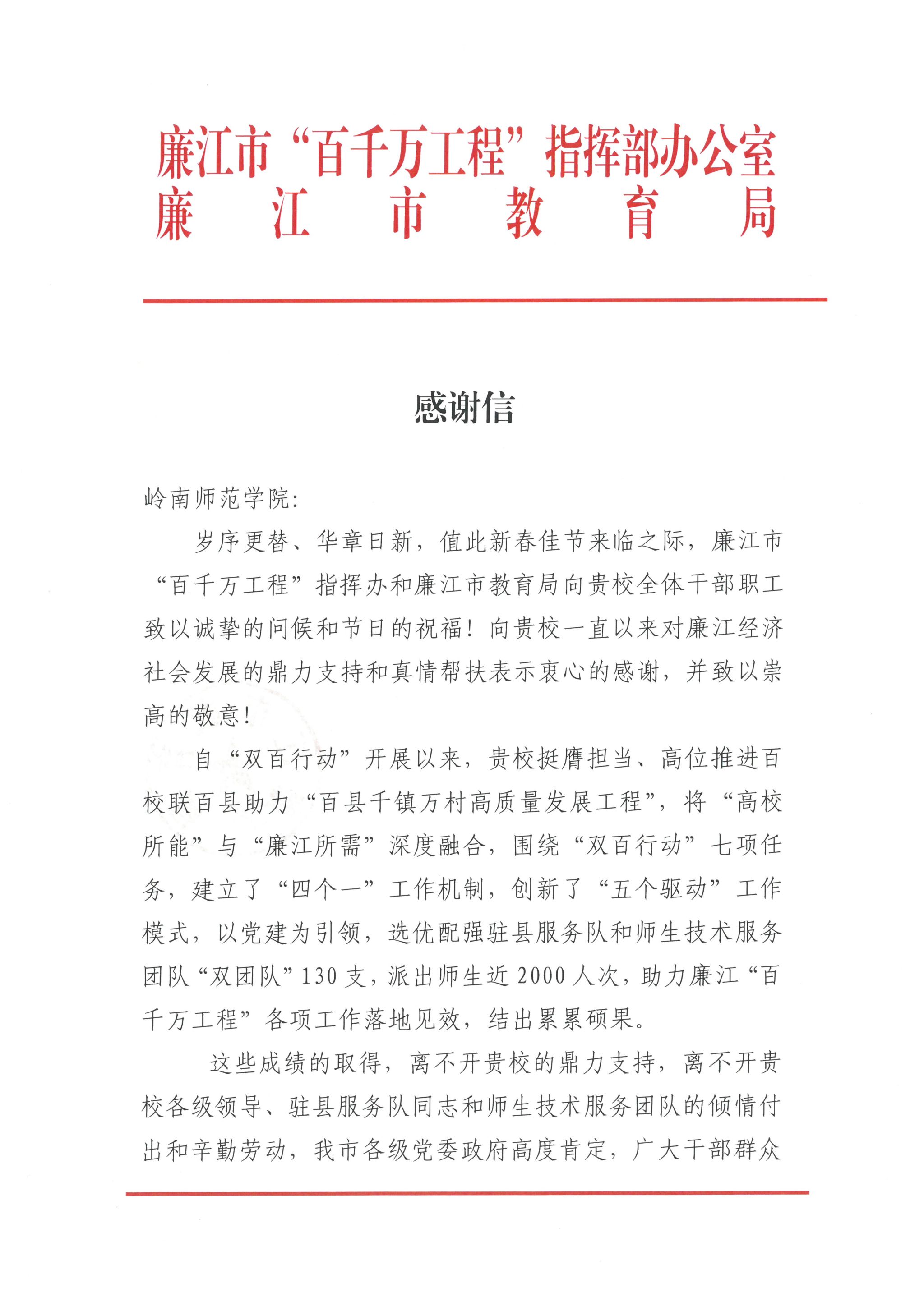 廉江市“百千万工程”指挥办公室和廉江市教育局向岭南师范学院发来的感谢信