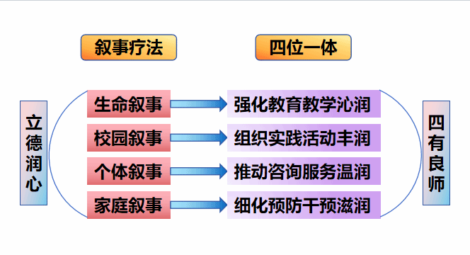 在“叙事+润心”的心理健康教育模式下,学校逐步形成了教育教学沁润、实践活动丰润、咨询服务温润、预防干预滋润——“四位一体”的大学生心理健康教育工作体系,结合“五育并举”的工作要求,在工作中融入思想政治教育要素和叙事理念,尊重学生是自己生命的专家,用生命故事打动心灵,回归“自我教育、自我成长”的心理育人本源,实现了育德和育心的结合,有效培育了一批心理健康素质较高,“有理想信念、有道德情操、扎实学识、有仁爱之心”的“四有”好老师。