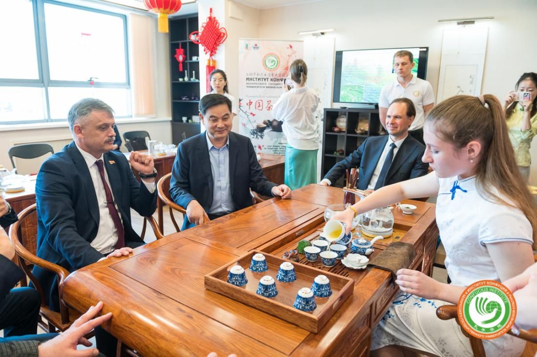 代表团一行首先考察了孔院先进的远程教学设施和现代化教学区,对孔院的教学硬件建设和育人环境给予了高度评价。随后,在古色古香的茶艺室内,2024年“汉语桥”大学生组白俄罗斯赛区冠军、全球20强选手高银栗同学为来宾献上了一场精彩的中国茶艺表演,带领来宾品鉴茶香,领略中国茶文化的深厚底蕴。