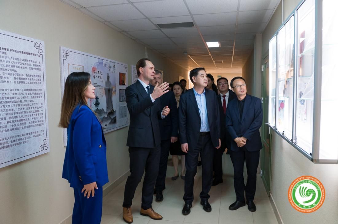 6月8日,白俄罗斯国立体育大学迎来重要访客。中国国家体育总局副局长张家胜,白俄罗斯体育与旅游部部长科瓦尔丘克・谢尔盖(Ковальчук Сергей)、副部长巴拉诺夫・亚历山大(Баранов Александр)一行莅临白俄罗斯国立体育大学,并参观了全球唯一的体育类孔子学院——岭南师范学院与白俄罗斯国立体育大学合作举办的孔子学院(以下简称“白体大孔院”)。白体大校长雷普金・谢尔盖(Репкин Сергей)、第一副校长克利诺夫・弗拉基米尔(Клинов Владимир)、白体大孔院中方院长宋鹏、白方院长卡斯捷耶娃・娜塔莉亚(Костеева Наталия)热情出席接待活动。