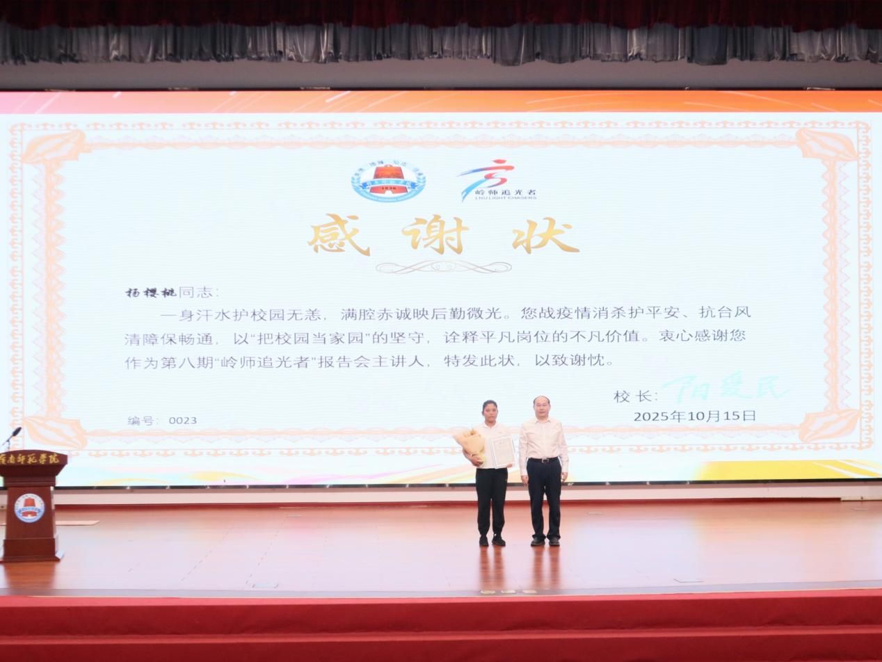 杨樱桃的工具包,装着校园的四季:喷壶里的消毒水、磨亮的油锯、沾着草屑的剪刀。基孔肯雅热防控期间,她放下患病孩子投身消杀,完成40余次作业、清理50余处孳生地;台风“麦德姆”过后,她扛油锯、剪断枝,两天清运120余车杂物抢通主干道,只为不耽误学生上课。“凌晨五点扫地的阿姨、连夜抢修水电的水电工、食堂灶台前挥汗的师傅……我们把‘平凡’二字写进了岭师的晨昏。”她说,这束光属于每一位逆风而上、默默奉献的后勤人。