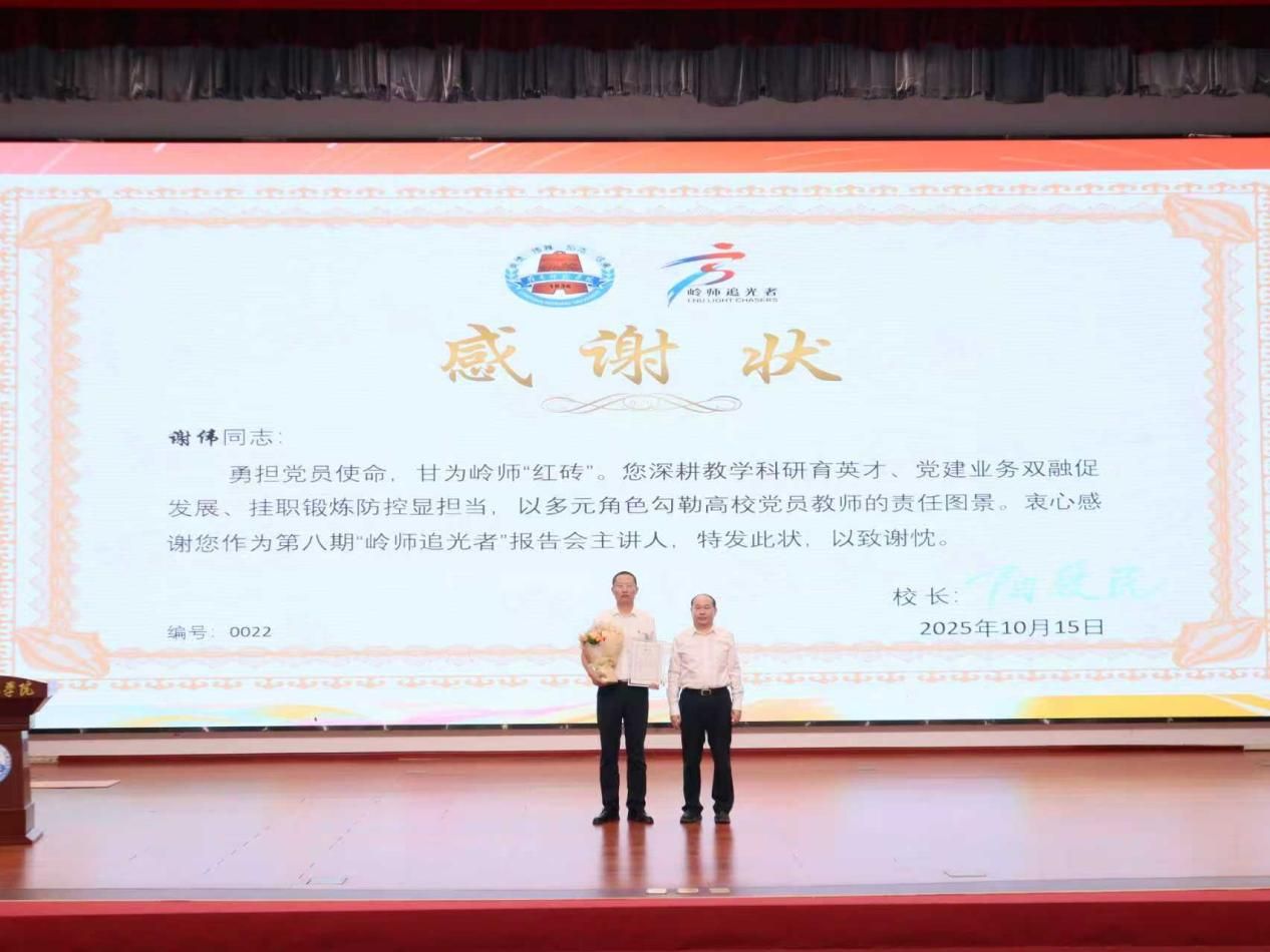 岭师新闻中心讯:10月15日,学校第八期“岭师追光者”报告会在音乐厅举行。物理科学与技术学院实验中心主任谢伟、后勤管理处校园环境管理中心员工杨樱桃、电子与电气工程学院辅导员贾冰妮登台演讲。学校党委副书记、校长阳爱民为三位老师颁发“岭师追光者”特制感谢状,党委副书记林晓敏、副校长金义富出席报告会。