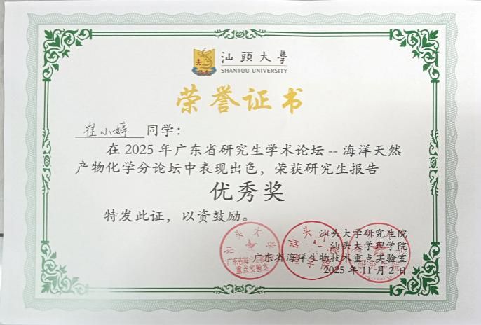 为加强创新人才培养体系建设,进一步提高研究生的培养质量形成有利于高层次、高质量、创造性人才培养的研究生培养体系。10月31日-11月2日,由广东省教育厅主办,汕头大学理学院、汕头大学研究生院、广东省海洋生物技术重点实验室联合承办的“2025年广东省研究生学术论坛—海洋天然产物化学分论坛”,在汕头大学学术交流中心成功举办。本次论坛吸引了来自中国海洋大学、中山大学、中国科学院南海海洋研究所、华南师范大学、广州中医药大学、广州医科大学、深圳大学、岭南师范学院、遵义医科大学、汕头大学等10多所科研院所及高校师生前来参会,会议规模约200余人,参赛选手(含博士、硕士研究生)实力强劲,竞争激烈,评审专家由全国知名专家、教授等担任。