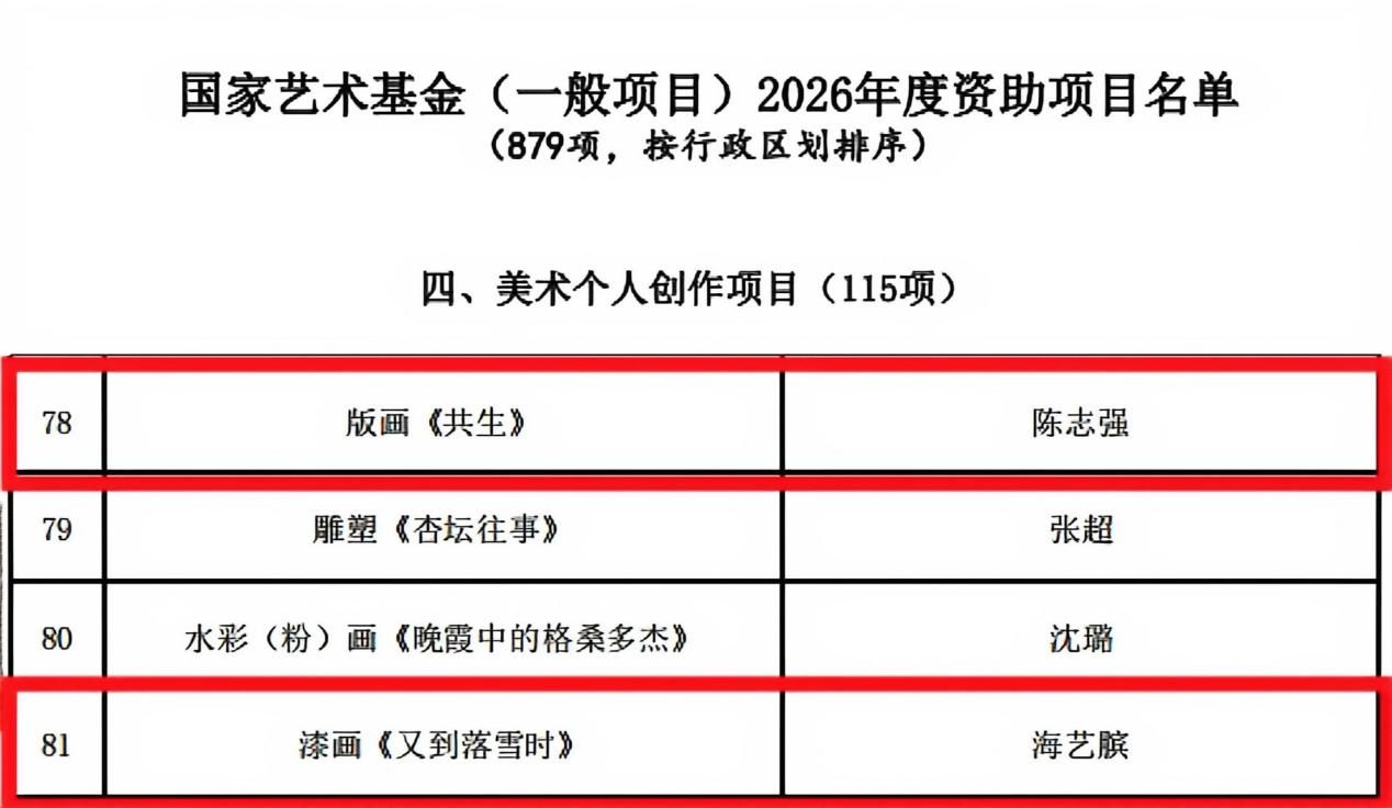 近日,国家艺术基金管理中心正式公示了国家艺术基金(一般项目)2026年度资助项目立项名单,学校美术与设计学院海艺膑老师申报的“漆画《又到落雪时》”和陈志强老师申报的“版画《共生》”成功获批立项。