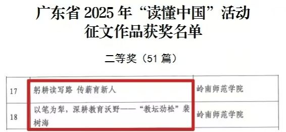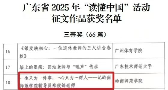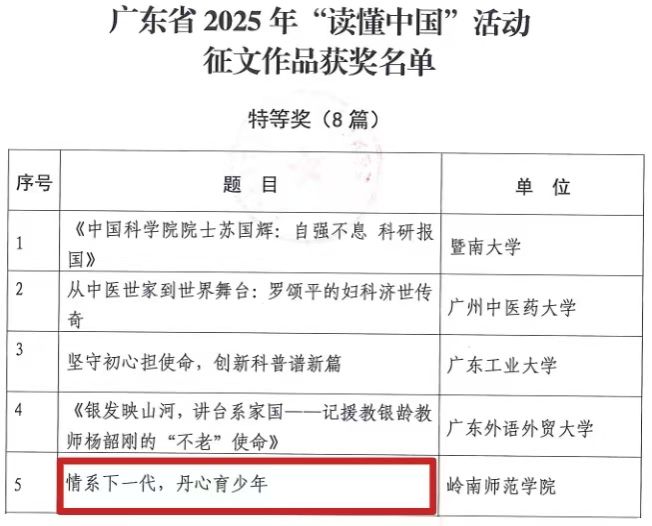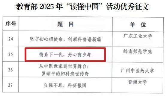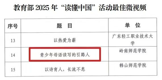 2025年“读懂中国”活动微视频作品《青少年母语读写的引路人——岭南师范学院关工委主任刘海涛访谈》获教育部关工委最佳微视频奖、省教育系统关工委微视频特等奖