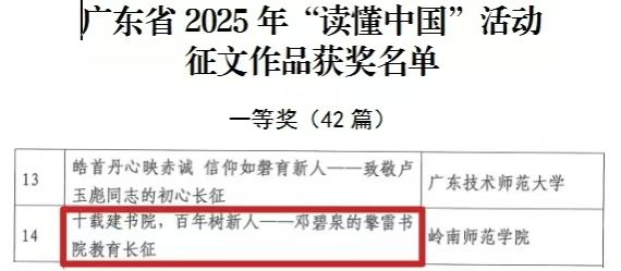 2025年“读懂中国”活动微视频作品《赓续书院教育 承传雷州文化——擎雷书院荣誉院长邓碧泉访谈》获省教育系统关工委微视频一等奖