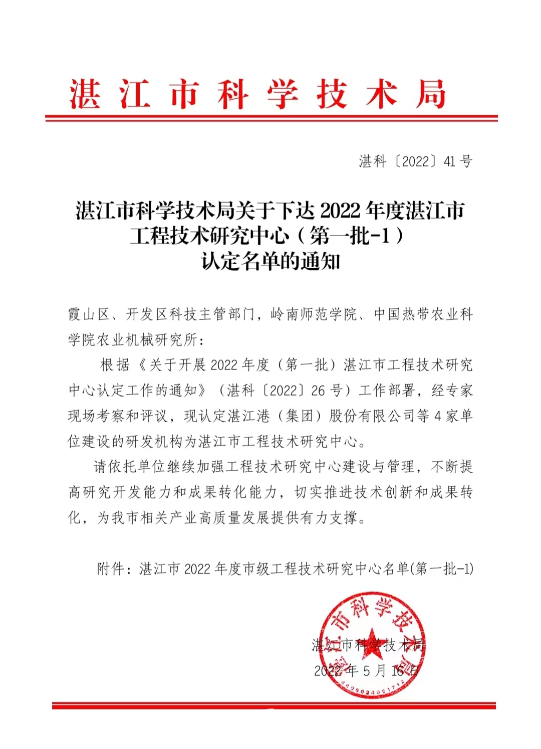 湛江市科技局下达2022 年度湛江市工程技术研究中心(第一批-1)认定名单通知