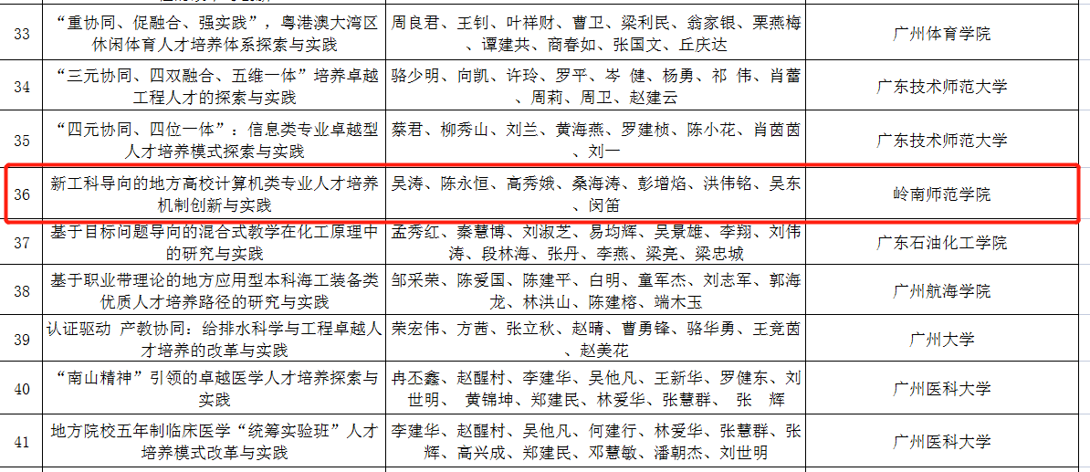 经推荐、评议、公示、省教育厅审定,由吴涛、陈永恒、高秀娥、桑海涛、彭增焰、洪伟铭、吴东、闵笛团队完成的《新工科导向的地方高校计算机类专业人才培养机制创新与实践》项目获高等教育类一等奖。兰艳泽、金义富、周立群、尹宁伟、黄桦、李斌辉、邓倩文、张子石团队完成的《“一本两代三全四得五育”高质量新师范人才培养体系的岭师实践》项目和许抄军、刘海英、沈炜、王松波、刘长军、赵改玲、孟毅、陈智崧、朱琪、梁宇卫、周剑熙、钟足峰、王亚新团队完成的《新商科“1+3+N”实践教学体系构建与实施》项目获高等教育类二等奖。石梦良、赫云鹏、彭展、黄岱、廖健华、施茵茹团队完成的《特殊儿童适应性课程的发展与实践》项目获基础教育类二等奖。