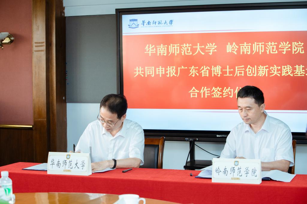 随后,双方签订了《华南师范大学与岭南师范学院关于共同申报广东省博士后创新实践基地合作协议书》。