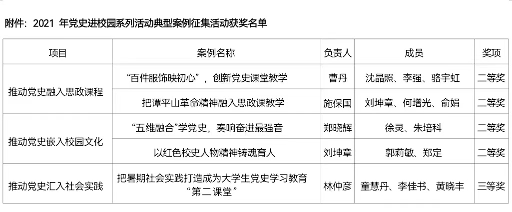 其中,曹丹主持的《“百件服饰映初心”,创新党史课堂教学》、施保国主持的《把谭平山革命精神融入思政课教学》获推动党史融入思政课程类案例二等奖;郑晓辉主持的《“五维融合”学党史,奏响奋进最强音》、刘坤章主持的《以红色校史人物精神铸魂育人》获推动党史嵌入校园文化类案例二等奖;林仲彦主持的《把暑期社会实践打造成为大学生党史学习教育“第二课堂”》获推动党史汇入社会实践类案例三等奖。