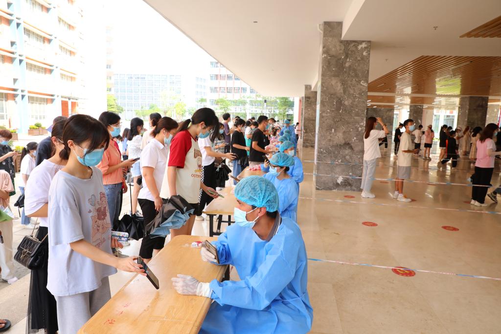 8月28日下午2:30,检测正式开始。记者在现场看到,全校共设置了三个检测点分30个采样小组同时进行:其中第五教学楼一楼中厅17组、雷阳广场12组、为方便离退休老人参检学校专门在燕岭区(旧区)排球场设置1组。整个检测过程井然有序——师生扫描场所码,志愿者查验健康码、测温,医务人员扫描核酸检测码、进行核酸检测。