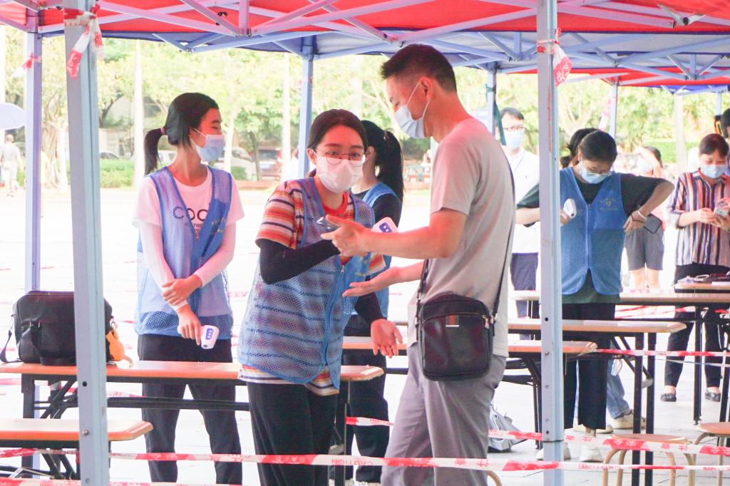 志愿者在雷阳广场采样点测温并检查场所码(廖梓希摄)