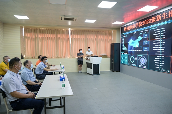 校长阳爱民带队到网信中心数据中心查看智慧大屏实时展示的新生报到情况(范昕怡摄)