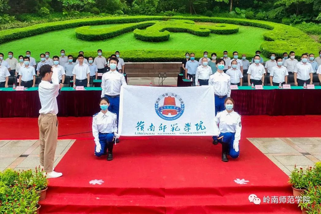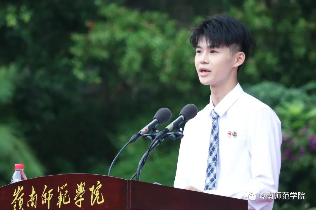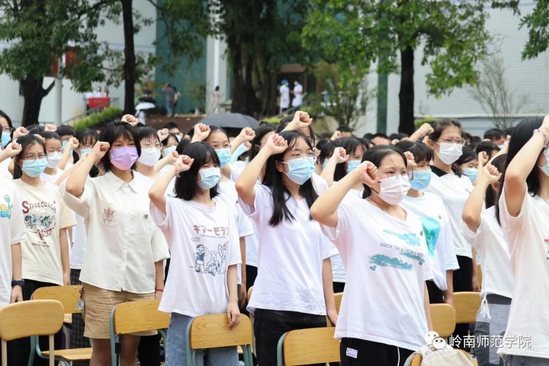 “铭记岭师校训,传承雷阳文脉,弘扬师道精神,厚植家国情怀……为国家富强民族复兴努力奋斗!”典礼上,全体新生握起右拳,面对校旗集体庄严宣誓。铿锵有力的誓言,振奋人心的誓词,在雷阳广场响彻云霄。