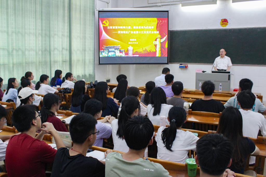 阳爱民从广东省第十三次党代会会议概述、党代会报告的主要内容,以及汲取智慧和精神力量做奋发有为的青年三个方面向同学们详细讲述了广东省第十三次党代会精神。指出省第十三次党代会是坚持以习近平新时代中国特色社会主义思想为指导,忠诚拥护“两个确立”、坚决做到“两个维护”,紧跟总书记、奋进新征程的大会,是一次统一思想、凝心聚力、求真务实、风清气正的大会,对广东当前和今后一个时期的发展具有重要意义。