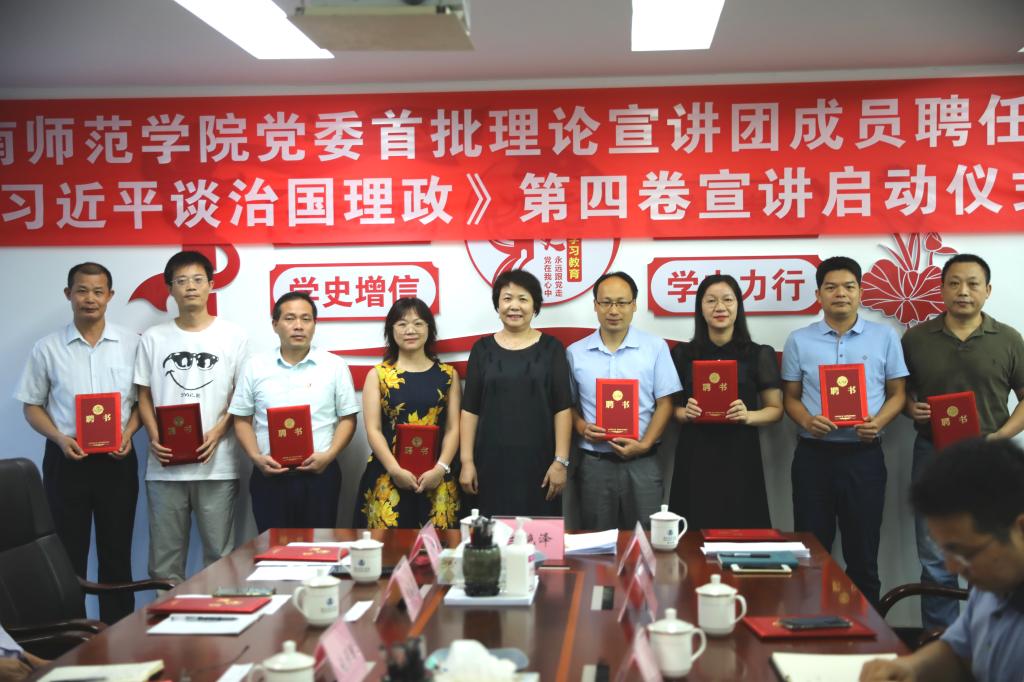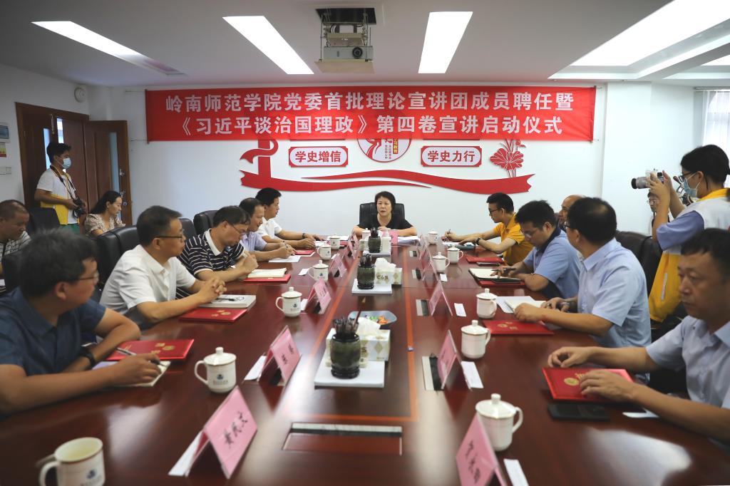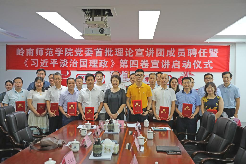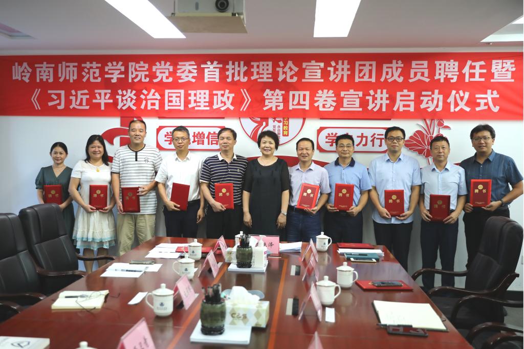 岭师新闻中心讯:9月22日下午,岭南师范学院党委首批理论宣讲团成员聘任暨《习近平谈治国理政》第四卷宣讲启动仪式在二号会议室举行。学校党委书记兰艳泽为宣讲团成员颁发聘书并讲话。党委副书记黄达海被聘为学校党委理论宣讲团团长,党委常委、宣传部部长刘坤章,马克思主义学院院长何增光被聘为副团长,刘鑫淼等21位专家学者被聘为宣讲团成员。