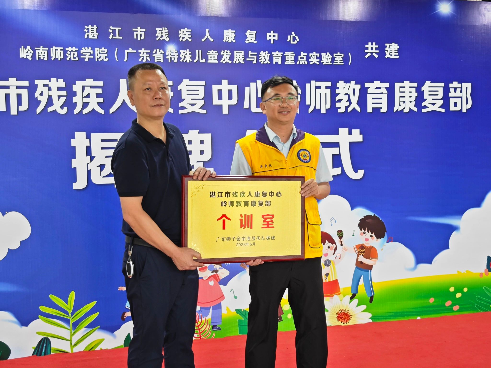 现场,广东省残疾人联合会党组成员、副理事长柯沫夫以及岭南师范学院、湛江市残联的负责人为湛江市残疾人康复中心岭师教育康复部揭牌。广东狮子会中湛服务队向湛江市残疾人康复中心移交援建岭师教育康复部个训室、体能室。