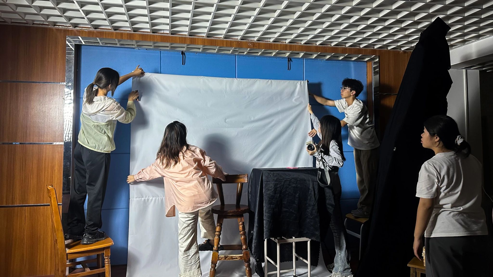 一间活动室、一张幕布、一把高脚凳