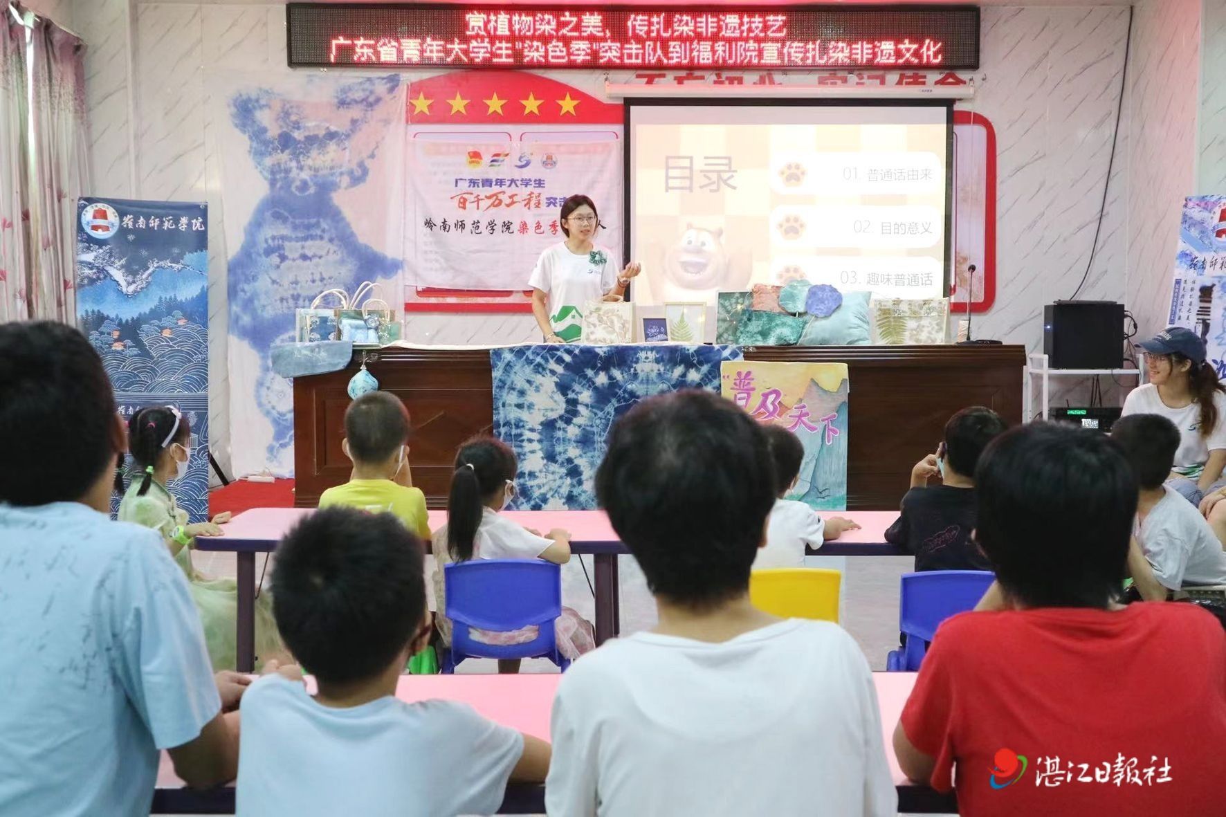 在廉江市和寮镇的一个购物广场前,一群大学生在帐篷下的桌子摆满了各式扎染工艺品。这是岭师美院“染色季”突击队在推广植物扎染非遗文化,他们在帐篷里讲解示范及引导当地居民做扎染。“我们每年都去各地乡村、街道宣传植物染技术,希望更多人知道并懂得做植物染。”队员们在与居民交流时互诉心声。之后,突击队队员们又带着植物染技术走进福利院、走进街道。