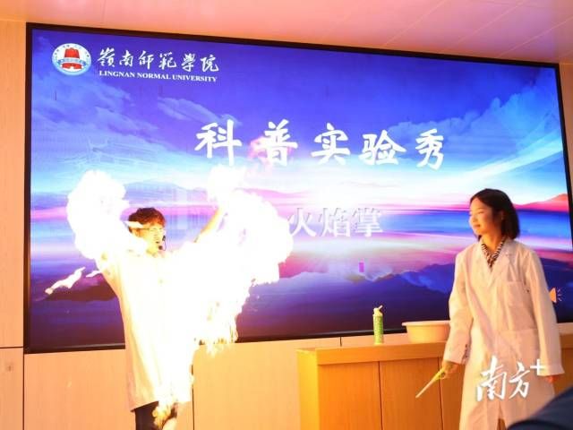 岭南师范学院物理科学与技术学院的学生现场展示液氮造雾、火焰掌实验,通过冰与火的直观碰撞,让抽象的物理知识变得可感可知,引得台下同学们尖叫连连、好奇不已。科普剧《司南北斗,照亮千年航道》则以时空穿越的叙事手法,串联起东汉张衡发明司南的古代智慧与现代北斗导航系统的攻坚故事,在生动演绎中致敬科研工作者,潜移默化地培育学生的科学精神与家国情怀。