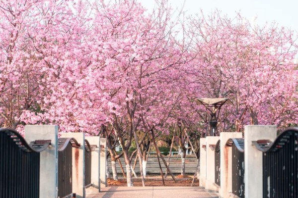 路的两旁也排列着一棵棵靓丽的樱花树