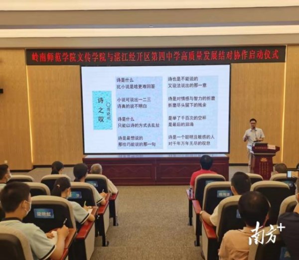 “诗人要有一颗诗心,既要歌咏个人情感,更要歌咏伟大时代,将‘小我’融入‘大我’,用诗歌咏祖国。”4月26日,湛江市经济开发区第四中学学术报告厅座无虚席、掌声迭起。岭南师范学院文学与传媒学院史习斌教授为该校师生作题为《诗歌写作五台阶》的“教授博士中小学讲坛”首讲。讲座结束后,岭南师范学院与经开区四中基础教育高质量发展结对帮扶正式启动。
