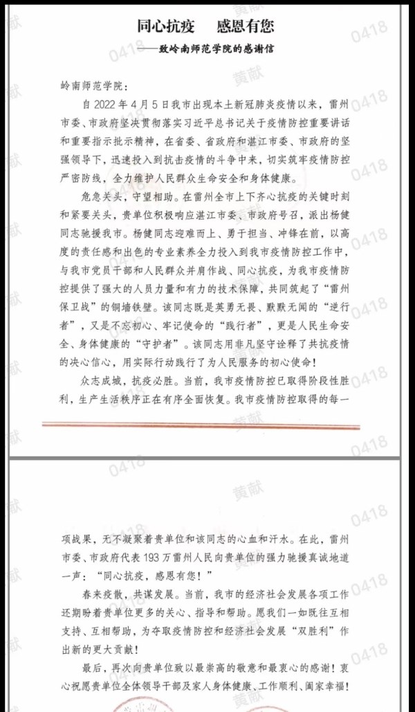 “该同志既是英勇无畏、默默无闻的‘逆行者’,又是不忘初心、牢记使命的‘实践者’,更是人民生命安全、身体健康的‘守护者’。”近日,岭南师范学院收到一份特殊的感谢信,中共雷州市委、雷州市政府在感谢信中对岭师教师杨健勇于担当、不畏艰辛、逆行“疫”线的奉献精神给予高度肯定。