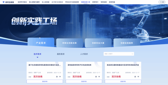 推动研究生面向真实问题开展研究与实践,让学术研究紧扣产业实际,助力科研成果与产业需求实现双向匹配。目前已汇聚50万余条产业真实需求和待转化科技成果。